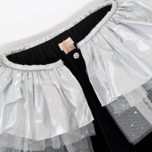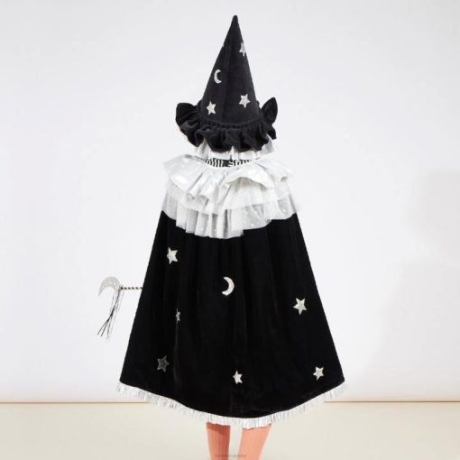 Przemień się w wiedźmę dzięki temu elegancko i przerażającemu kostiumowi. zawiera pelerynę i różdżkę wykonaną z aksamitu, tiulu i srebrnej lamy ze srebrną, brokatową gwiazdą i detalami księżyca. wspaniały strój na Halloween lub zawsze, gdy masz ochotę rzucać zaklęcia w wielkim stylu!