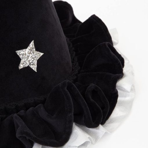 ten kapelusz wiedźmy z marszczonymi detalami jest naprawdę bardzo stylowy. jest wykonany z czarnego aksamitu, ze srebrnymi lanymi i srebrnymi brokatowymi gwiazdami i księżycami. niezbędny dodatek na Halloween lub dodatek do pudełka z przebierankami, pozwalający na pomysłową zabawę o każdej porze roku.