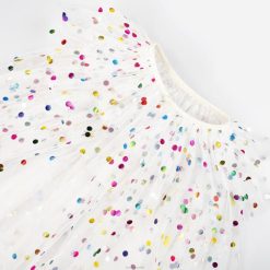 ten piękny, luksusowy zestaw do przebierania zawiera czteropoziomową tiulową pelerynę, koronę i różdżkę w kształcie gwiazdki z modnymi pomponowymi detalami. metaliczny, foliowany wzór kropek mieni się jak odcienie małych klejnotów, dając efekt tęczy kolorów. jest to idealne rozwiązanie do noszenia na specjalne uroczystości lub do kreatywnej zabawy.