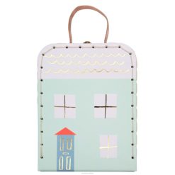 To niesamowity prezent dla małego dziecka, który może zabrać go w podróż lub bawić się w domu. wyposażony w mini walizkę, pięknie ilustrowaną przypominającą mały domek, ze skórzaną rączką i metalowym zapięciem. w środku znajduje się urocza lalka z bawełny w kolorze liliowym, stylowo ubrana w zieloną tiulową spódnicę, a jej bawełniana kołdra i różowa aksamitna poduszka są gotowe do snu.