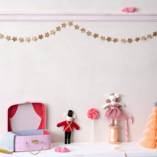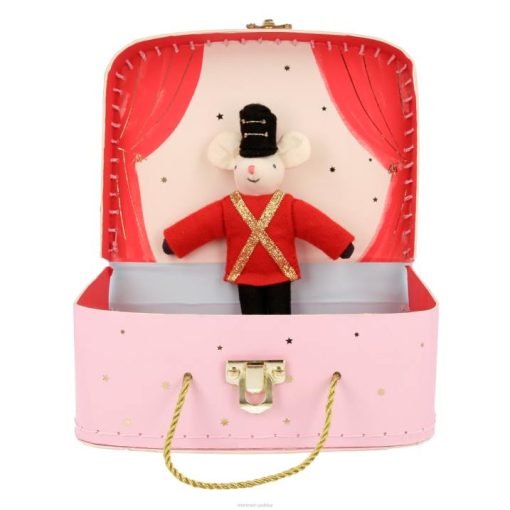 to wspaniały prezent dla dzieci kochających balet, który zapewni wiele godzin pomysłowej zabawy. Zawiera małą walizkę, którą można otworzyć, ukazując tło teatralne i 2 urocze myszy-tancerki baletowe z tkaniny. samica myszki ma piękną różową tiulową sukienkę, odpinane skrzydełka, tiarę i buciki. samiec myszy ubrany jest w strój żołnierza, z filcową kurtką i kapeluszem. W zestawie znajduje się także wspaniały kocyk z mini frędzlami, który można wykorzystać jako rekwizyt.