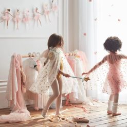 ta cudowna różowa peleryna będzie wyglądać niesamowicie na przyjęciach dla księżniczek lub podczas kreatywnych zabaw. jest wykonany z miękkiego tiulu ze wspaniałymi złotymi, brokatowymi gwiazdkami, które nadają efekt połysku.