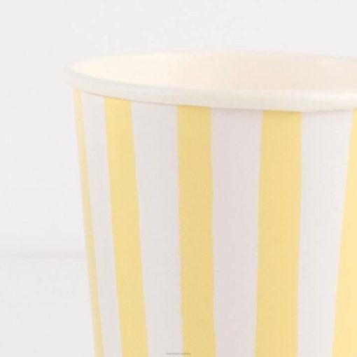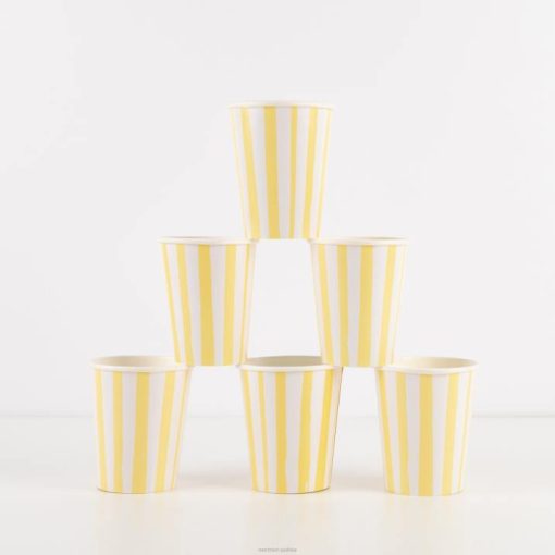 po co mieć zwykłe kubki, skoro można zachwycić gości czymś wyjątkowym Dodaj radosnego akcentu koloru swojemu imprezowemu stołowi dzięki tym kubkom w żółto-białe paski.