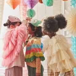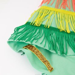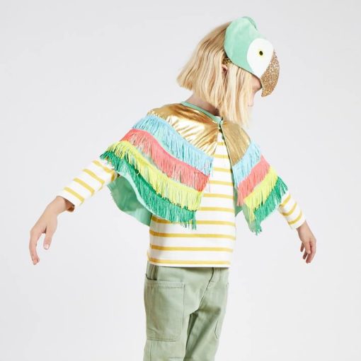Mali ludzie uwielbiają udawać, że latają, więc ten wspaniały kostium papugi to idealny prezent, który warto wskoczyć do ich pudełka z przebieralniami! zawiera dwa pięknie zaprojektowane i wykonane przedmioty – skrzydlatą pelerynę z kolorowymi frędzlami i oszałamiający nakrycie głowy wykonane z zielonego aksamitu z brokatową tkaniną i szwami. idealne do noszenia na imprezy lub do kreatywnej zabawy.