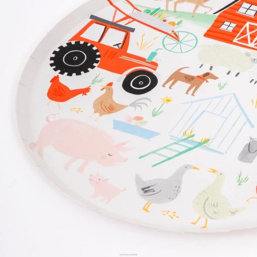 te kolorowe, wiejskie talerze obiadowe będą świetnie wyglądać na imprezowym stole. z pięknymi ilustracjami przedstawiającymi ruchliwe gospodarstwo rolne, z domem wiejskim, traktorem i wieloma zwierzętami gospodarskimi, z pewnością zachwycą gości na przyjęciu.